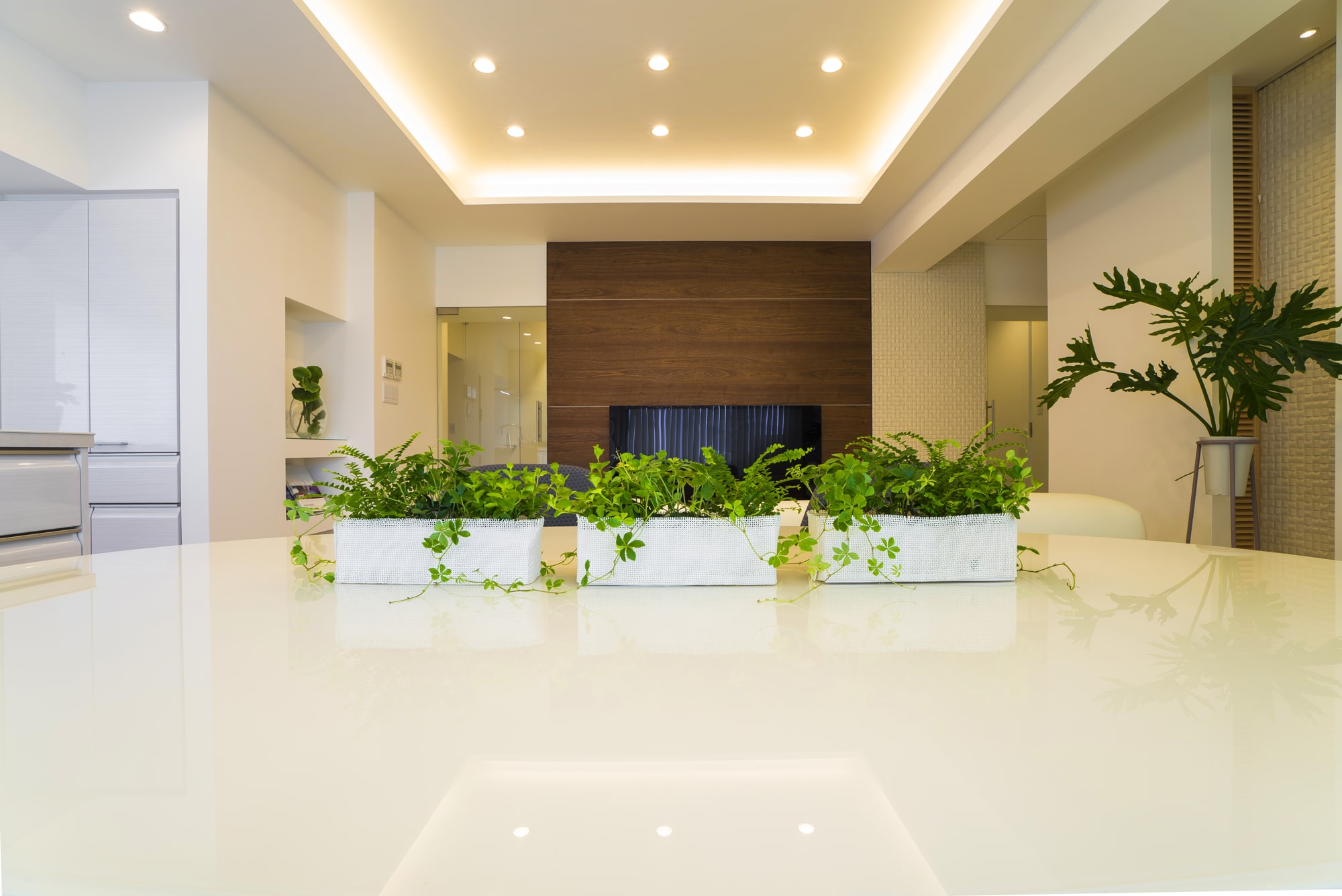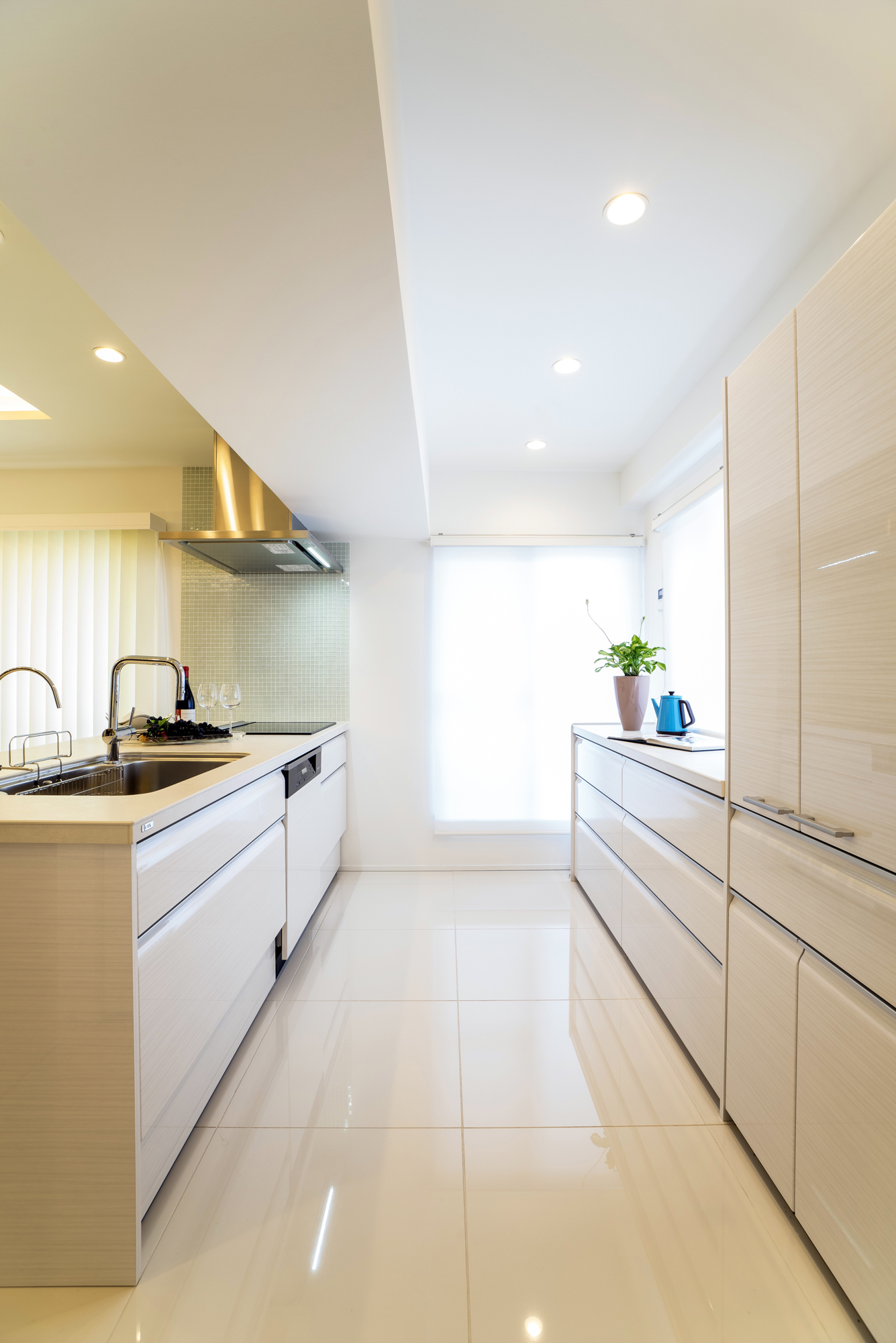 床は60cm×60cmの大判鏡面タイル貼り。夏は自然な冷たさでひんやりと。冬の寒さ対策として、リビング・ダイニング・キッチンには遠赤外線床暖房を完備。タイルが蓄熱した心地よい温もり、遠赤外線効果によりポカポカ暖かな空間に。またエアコンは天井埋込とし見た目もスッキリとなりました。