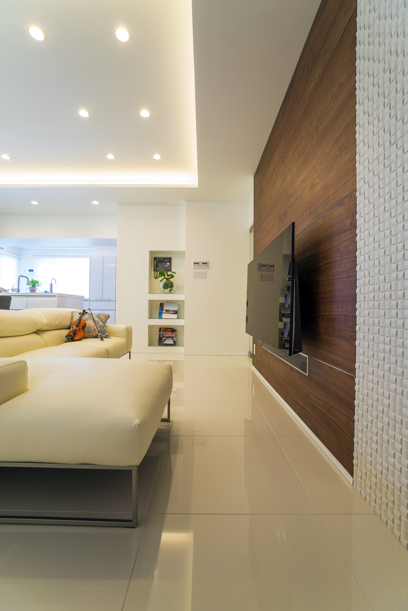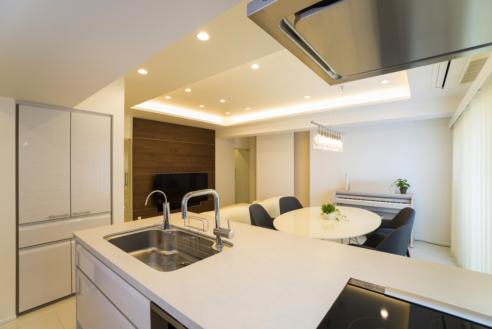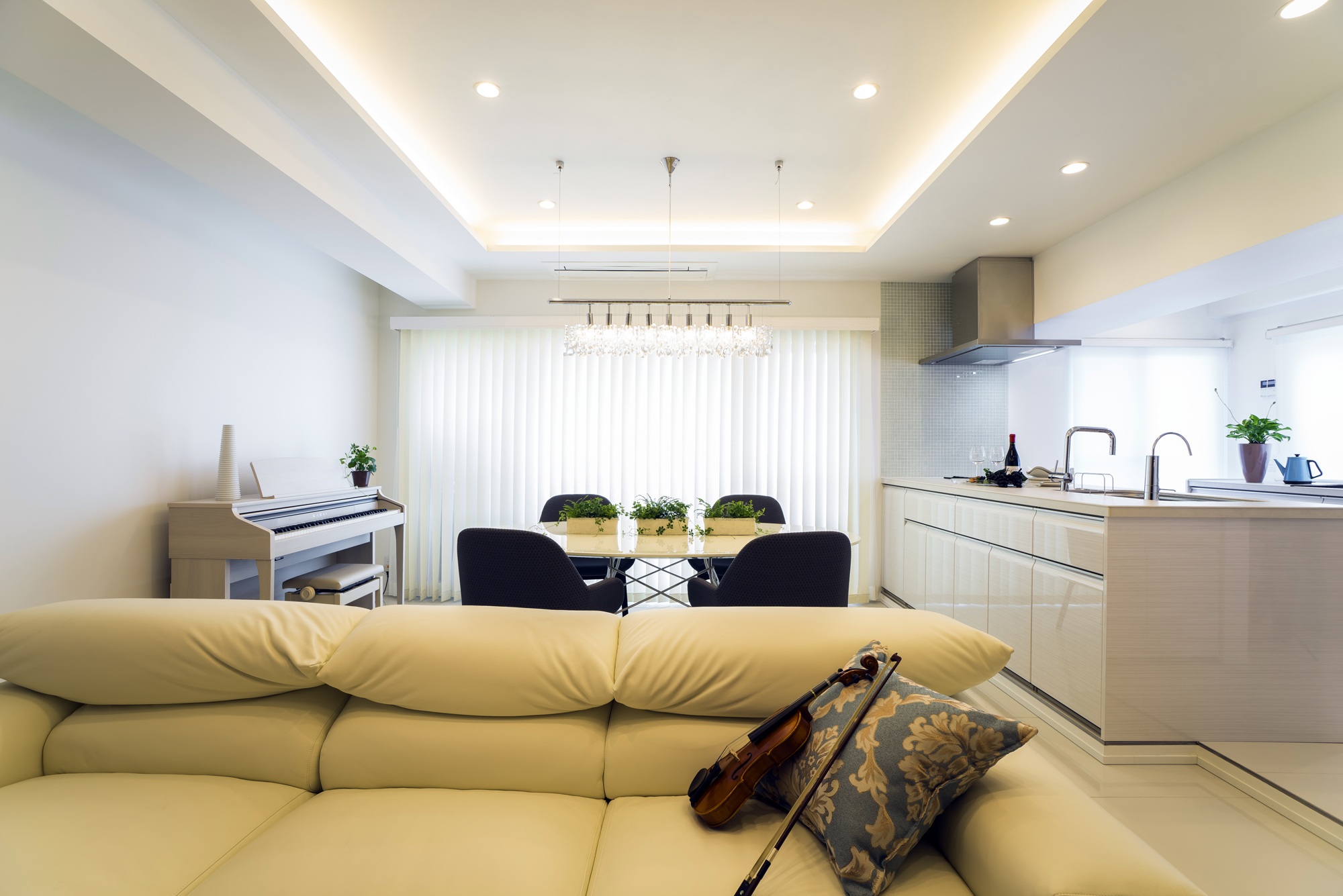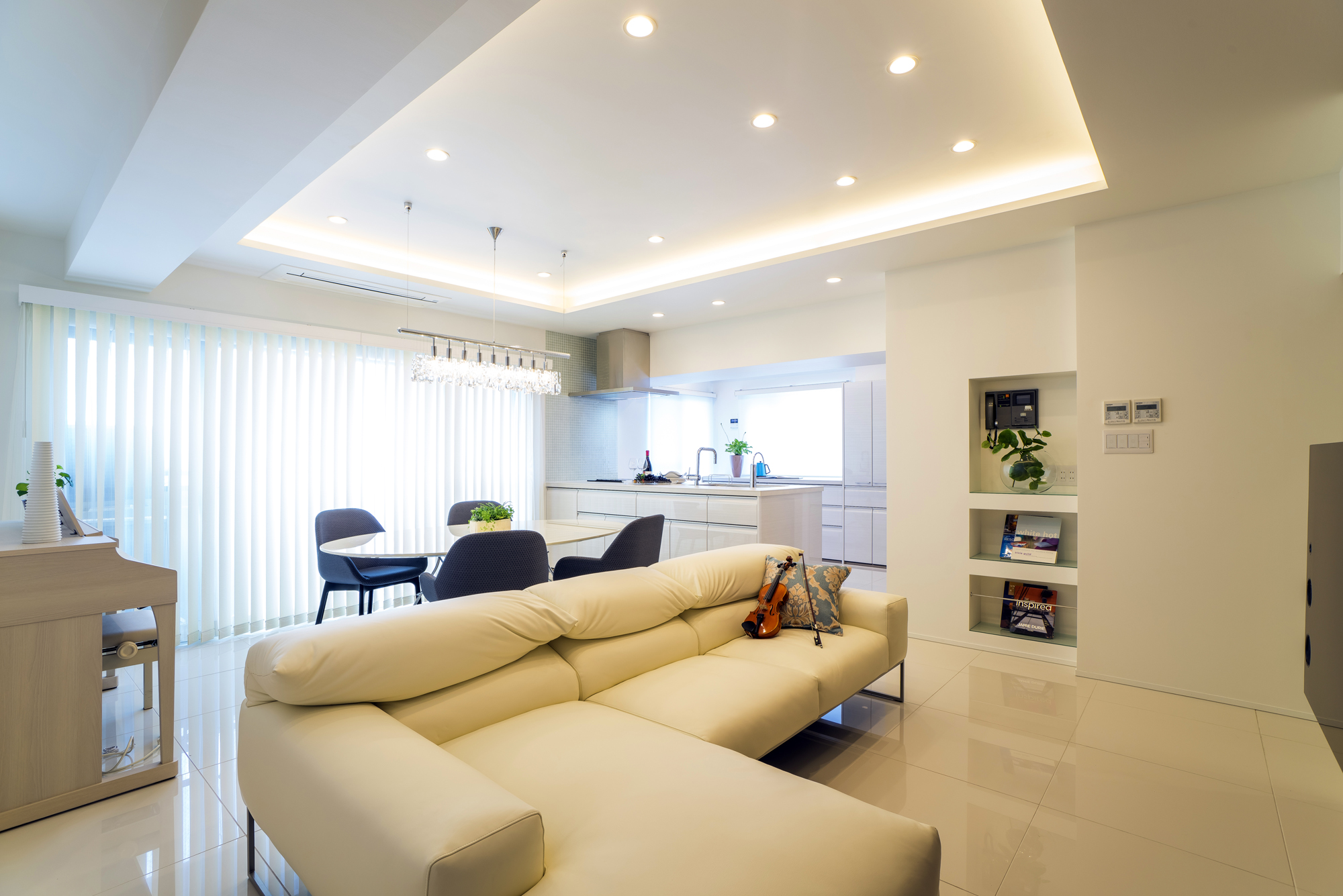 LDKの折り上げ天井は高さ2m60cm。間接照明の光も相まって高さと広がりのある開放感溢れる空間に。ソファの位置にはリノベーション前はセミオープンキッチンがあり、南側からの自然光を遮り玄関ホールは暗く日中でも照明が必要でした。マンション特有の閉鎖的で暗い玄関ホールはリビングに面している2ヶ所のドアをガラスドアにし採光を確保。以前より格段に明るく、空間に奥行きと広がりを見せてくれるようになりました。またホワイトを基調とした空間に天然木のチェリーを使ったアクセントパネルを施すことで落ち着きを与えてくれる上質なリビングとなりました。