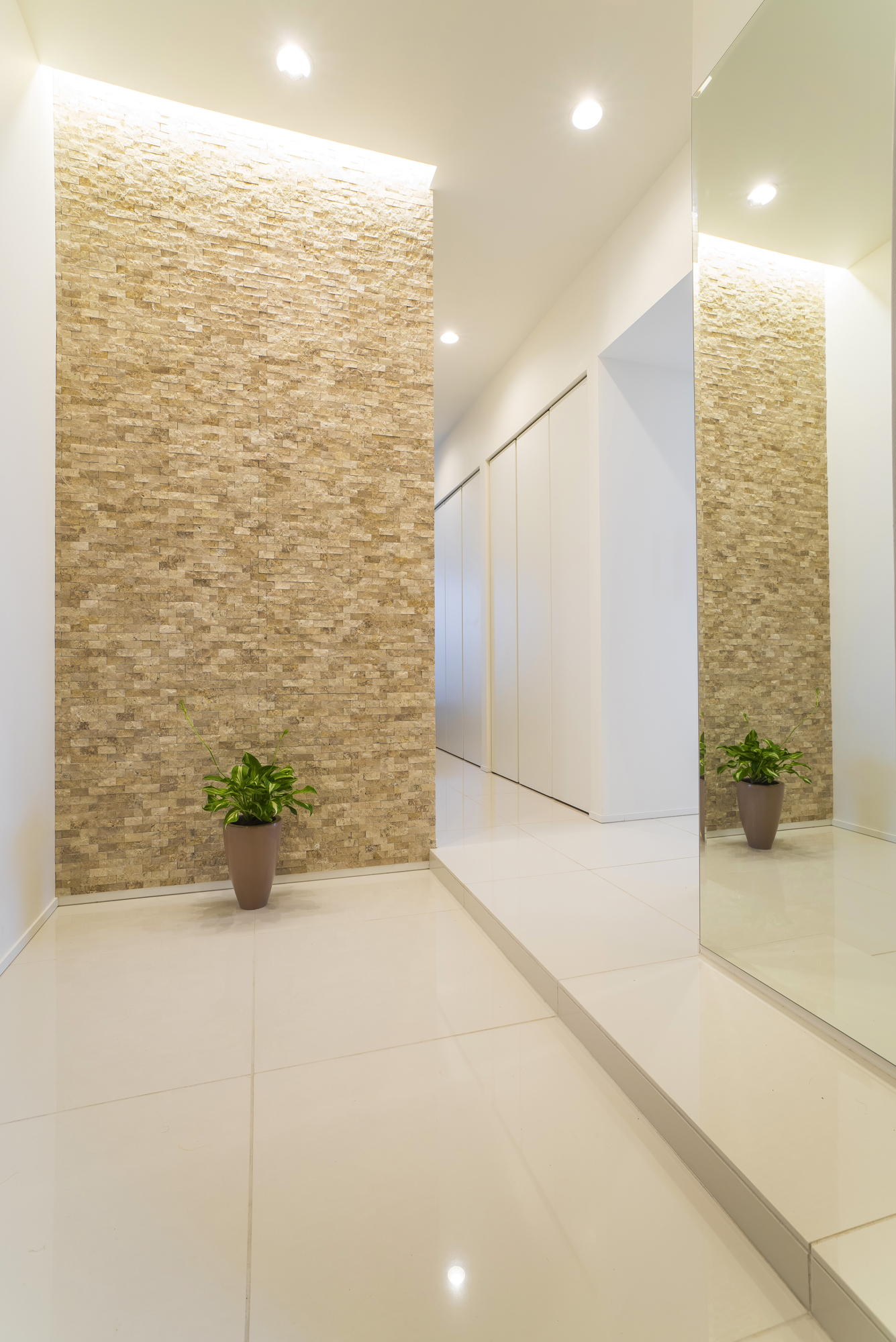 エントランス正面の壁面には天然石を施し天井よりの間接照明により家族と客人をもてなしてくれます。またドレスチェックのできる壁面ミラーはエントランスを広く演出してくれます。