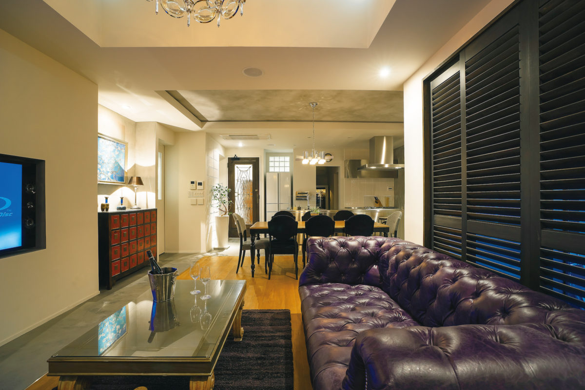 さらに、この住まいのために選んだ「なすび色」のソファと、窓のチャコールグレーのウッドシャッターが印象的な空間を演出。高級感あるラウンジのようなリビングダイニングが誕生しました。