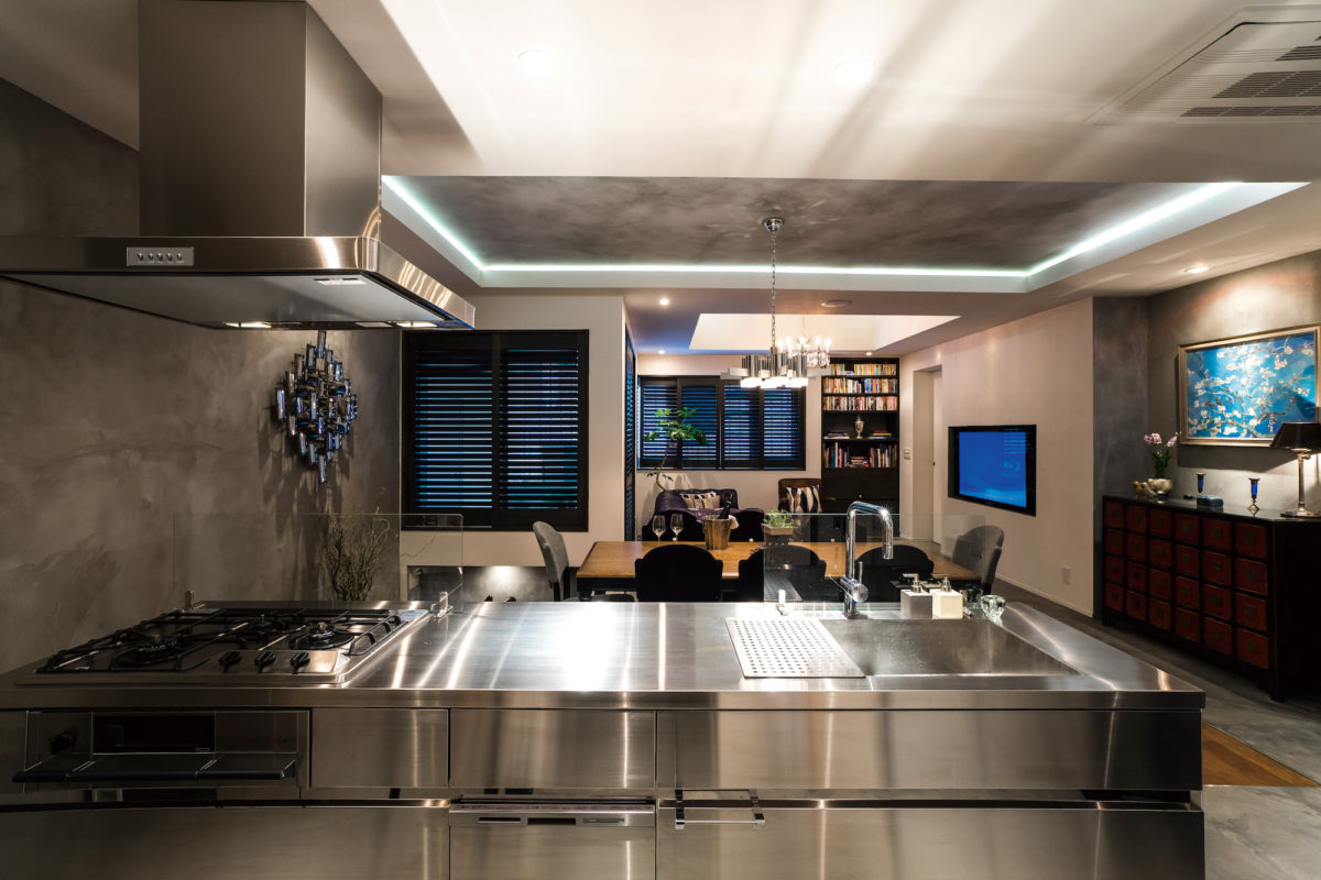 キッチンはヘアラインが美しいステンレスのペニンシュラタイプを採用。料理が好きなSさまのために、デザイン性はもちろん、高火力のビルトインコンロ、大容量の食器洗い乾燥機など、設備にもこだわっています。背面の収納もキッチンに合わせてステンレスで製作し、統一感を出しました。