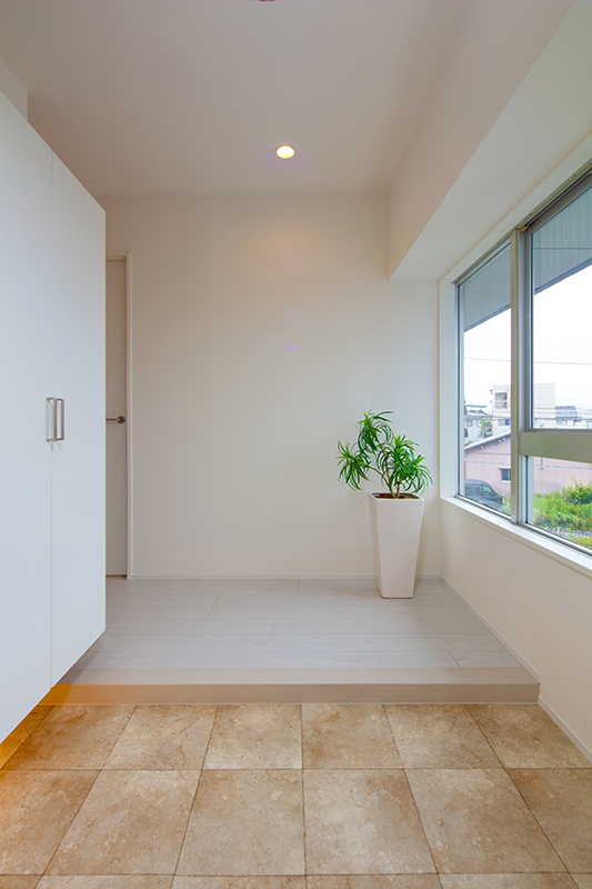エントランスは、シューズボックスを少し上げ間接照明を施しました。足元を照らす明かりが家族をもてなしてくれます。