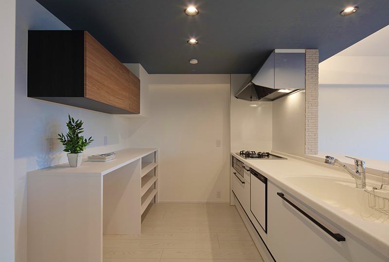 ホワイトを基調したさわやかなキッチン。対面にしたことでレンジフードの排気経路を確保するため、配管のみを部分的に囲むのではなく、天井全体を下げることでスッキリ。天井はブルーグレー、壁面吊りキャビネットはリビングボードと同素材のイタリアンウォールナット木目柄でアクセント。キッチンから背面キャビネットまでの距離は1.2メートルとゆったり広め寸法なのでご夫婦や親子でキッチンに立つ場合でも、互いにぶつかる事なくストレスフリーなキッチンです。