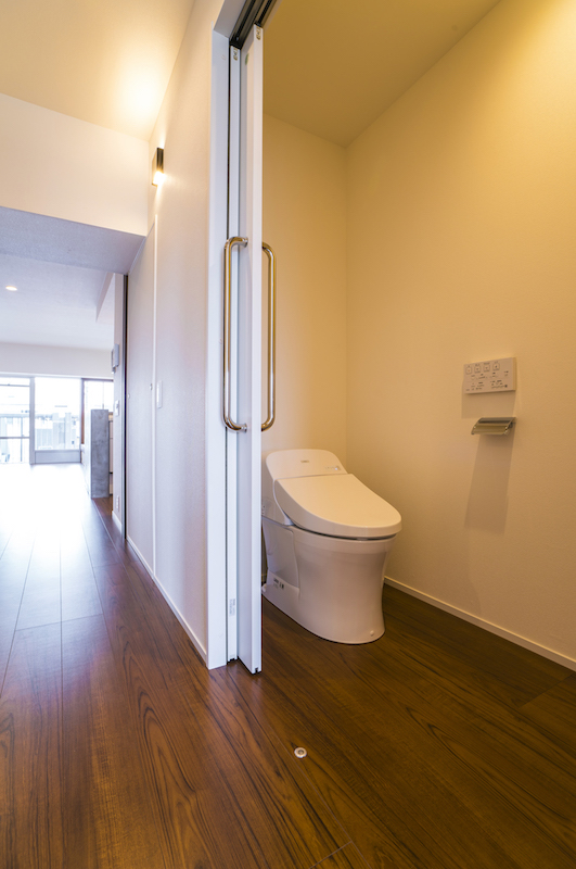 ホールからストレートにLDKへ。トイレの扉も2枚引込戸に変更。介助が必要になっても出入りはゆったり広々です。