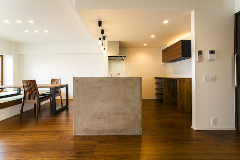 キッチンは対面式ペニンシュラタイプに変更。カウンターはモルタルを塗り防水も兼ねたウレタン塗装仕上げ。キッチン上の照明はレトロ感漂うフィラメントランプのLEDペンダントライトをチョイス。チークのフローリングとモルタルの土間感、レトロ照明が落着きのあるヴィンテージな空間を醸し出してくれます。