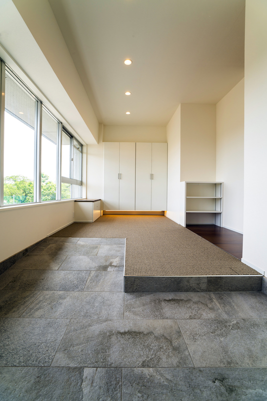 玄関から廊下への段差、廊下から水廻りへの段差があったマンションでしたが、室内の段差をゼロに。玄関から室内へはスロープを設けた広々エントランスに。正面にはシューズクローク、靴の脱ぎ履きの際にはベンチに腰掛け楽々と。