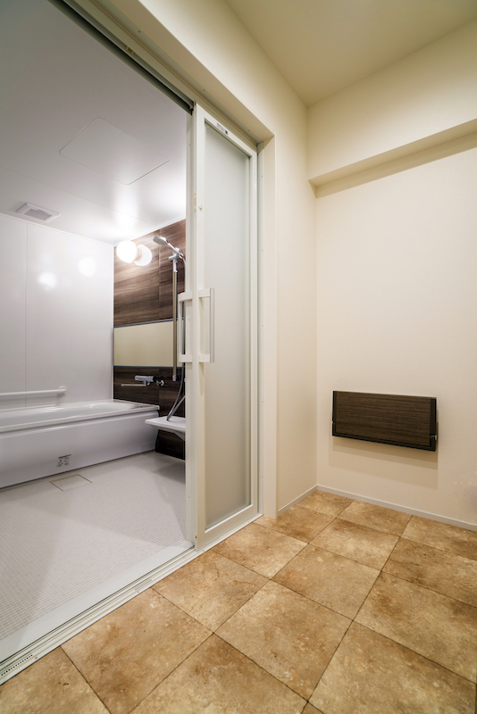 1.25坪ある広々ユニットバスの扉は2枚引込戸。出入りも広々です。また壁面に設置した折りたたみ式ベンチは着替える時の補助アイテム。