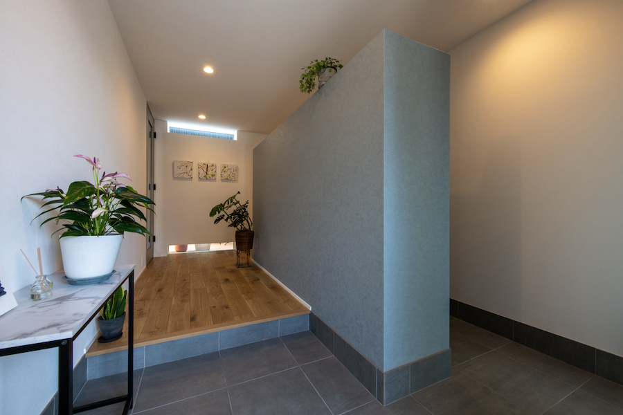 エントランスは一つの空間を靴棚を兼用したアクセント壁でゲスト用、ご夫婦用、別々としました。