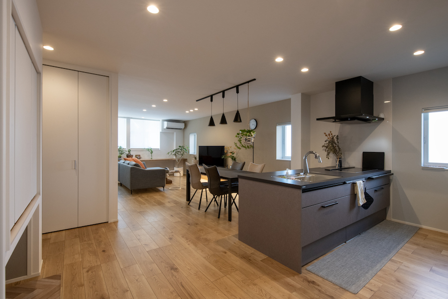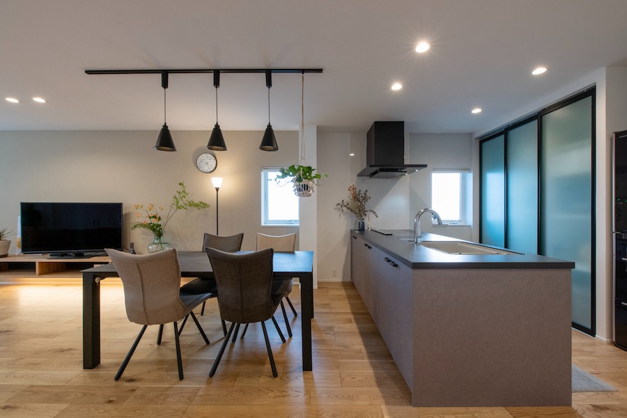 ペニンシュラキッチンはPanasonicを採用。トリプルワイドIH、タッチレスのスリムセンサー水栓など多機能で使い勝手の良いキッチンです。またブラックのワークトップが空間を締めてくれています。