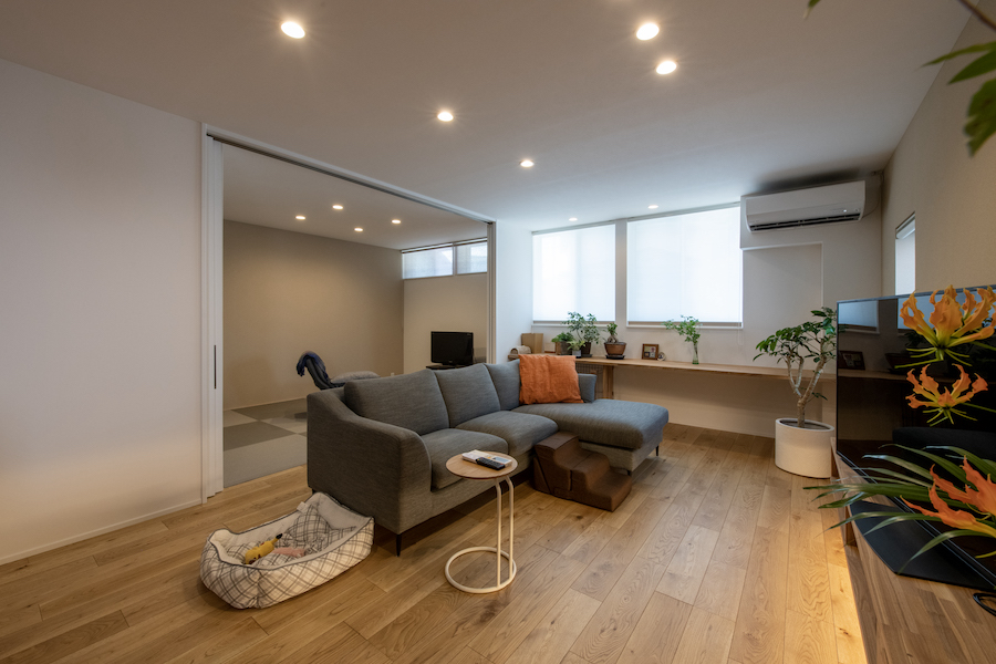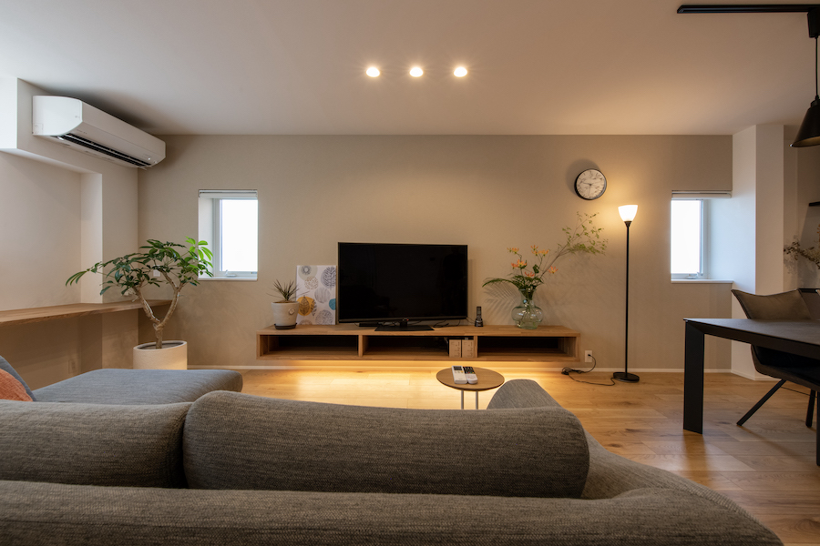 LDKは27帖強の広々空間。ホワイトを基調とした空間に床はオークのフローリング。リビングTV背面には聚楽調のアクセント壁をセレクト。「Japandi」な雰囲気を感じさせるモダンなLDKです。