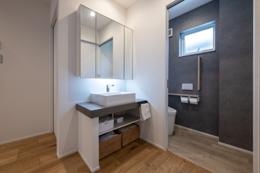 洗面スペースは将来を考慮し、あえてLDKの一角に。ご希望のカウンターの手洗いは視覚的にもすぐわかる見せる収納式に。トイレも落ち着きのあるモダンテイストです。