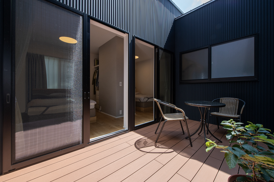 寝室、ホールに面している中庭ウッドデッキ空間。囲まれた空間では愛犬が人影を感じ無駄吠えしません。室内から外へ。太陽光を浴び、風を感じ、愛犬と共に時間を過ごす癒やしの空間。人目を気にすることがありませんので、昼夜関係なくカーテン無しで気軽に生活できます。