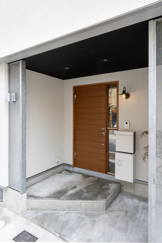 お施主様(T様)のご要望で外観はシンプルモダンなイメージがお好み。ということで、ホワイトを基調としたフラットな壁面に1階部分にはメタル素材とコンクリートで演出。無機質なアイテムの中に北欧の木製玄関ドアをセレクト。ドア袖のFIXは標準でトリプルガラスというハイスペック仕様です。ポスト&宅配BOXも色調を合わせスッキリと。
