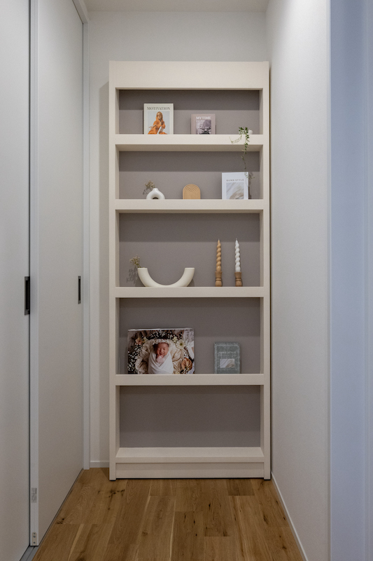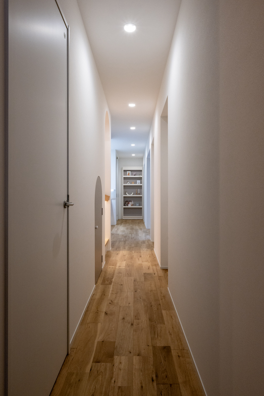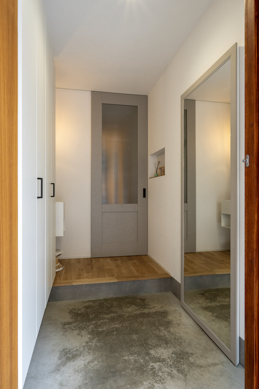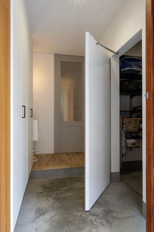 狭小住宅での設計で「玄関」をどのように確保するか・・・しかもT様ご家族はご友人が多いという事も考慮し家族にもゲストにも「狭い」というストレスを与えず、玄関の役割でもある玄関で必要な収納力の確保も検討し設計いたしました。