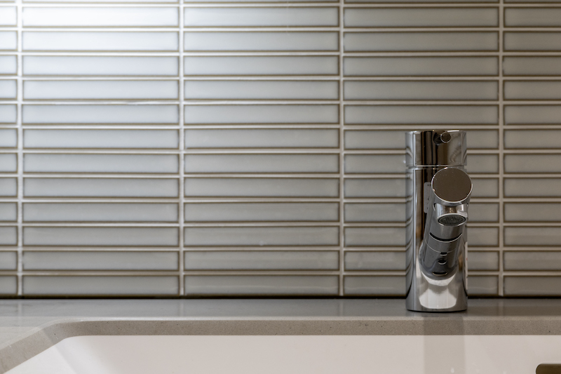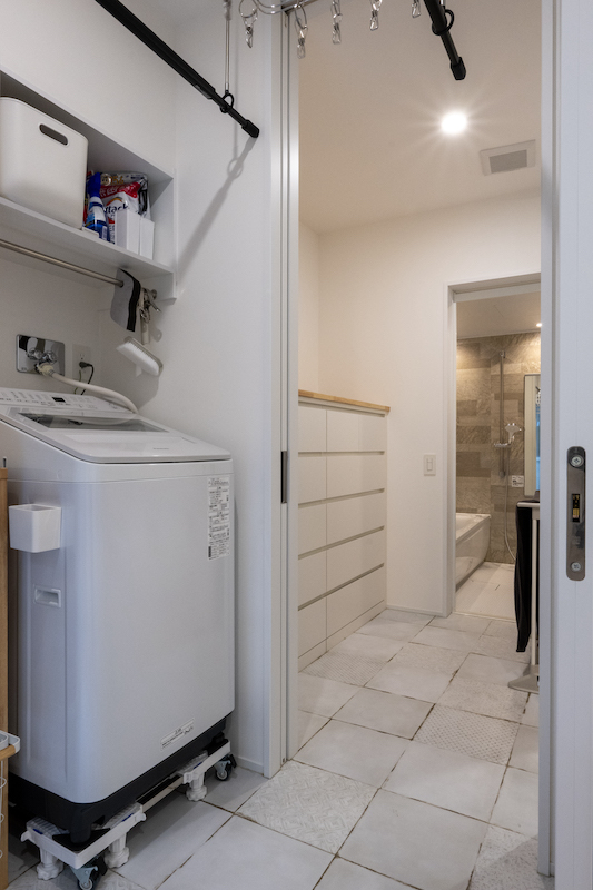 壁面は奥様と何度も素材確認をしてこだわり抜いたボーダータイル。ミラーBOXとのタイル割りもこだわり、美しいタイルラインを演出してくれています。