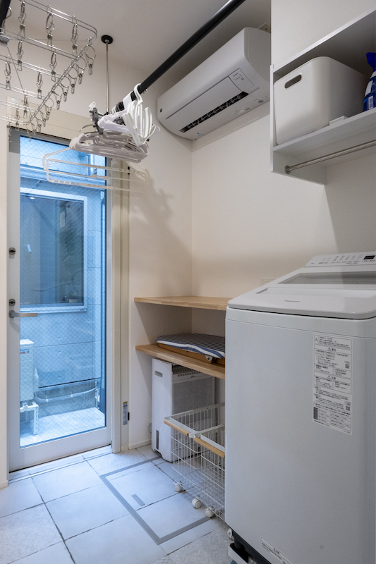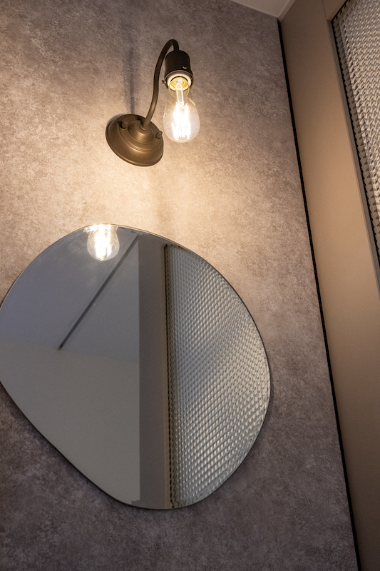 また、メイクは洗面で。というご要望で照明にも一工夫。上部にあるダウンライトはユニバーサル仕様をセレクト。お好みの照明角度に調整できるメイク専用ライトとしました。