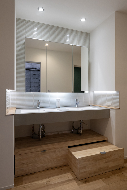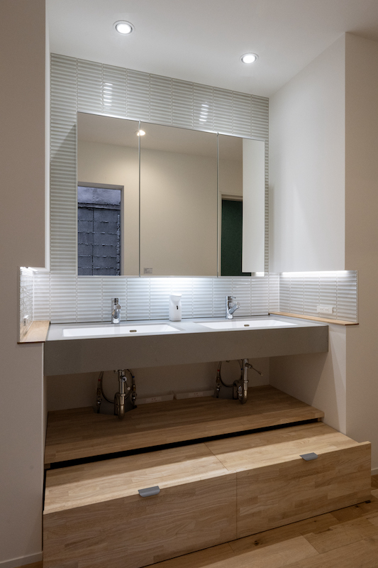 洗面カウンターはツーボール。両サイドの壁面にはミラーと同じ高さでニッチを造り上部にはミラー同様の間接照明を設置。また両サイドにスリムコンセントを設けることでドライヤーを同時に使うことが可能。ミラーBOX下部にはペーパータオル収納も完備。
