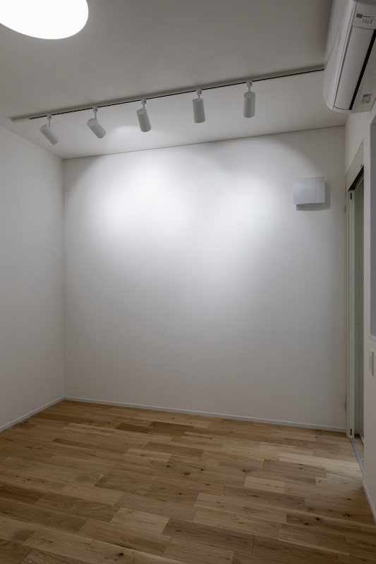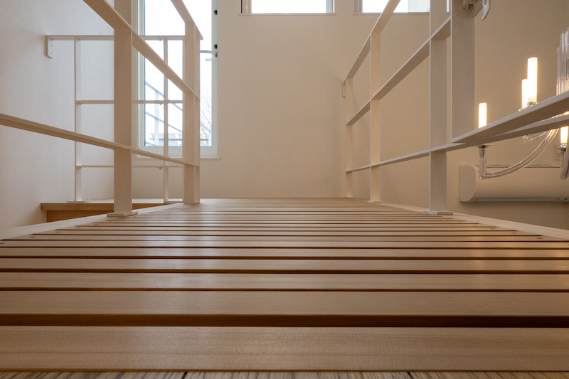 1階はトイレ、バス、洗面脱衣等の水まわりとご主人の書斎を設けた間取りです。狭小住宅の風通しを克服するため高山市内にある町家(旧家)の風通しを参考に建物の中央あたりに中庭を設けることによる「上昇気流」による風の抜け感を実現いたしました。