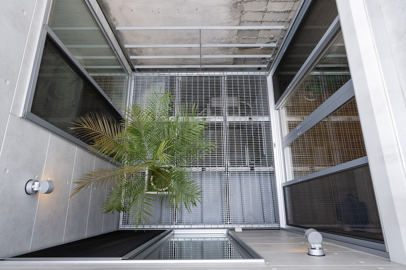 ホール、ランドリー、書斎に面している中庭。見上げるとグレーチングデッキがありますが、この空間により採光と快適な風通しを実現しました。