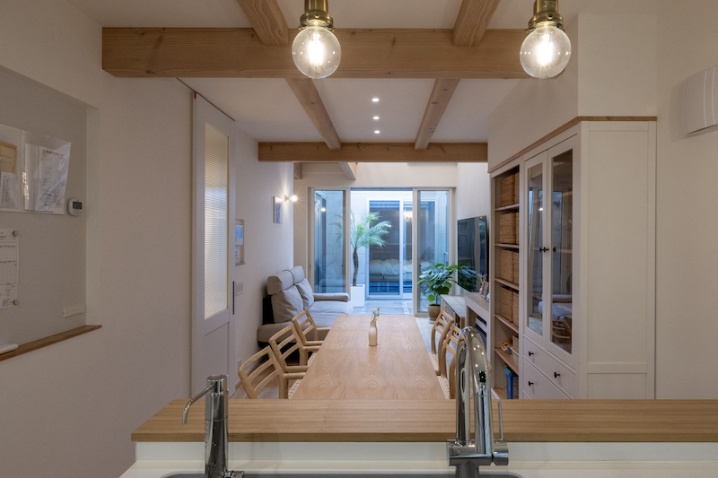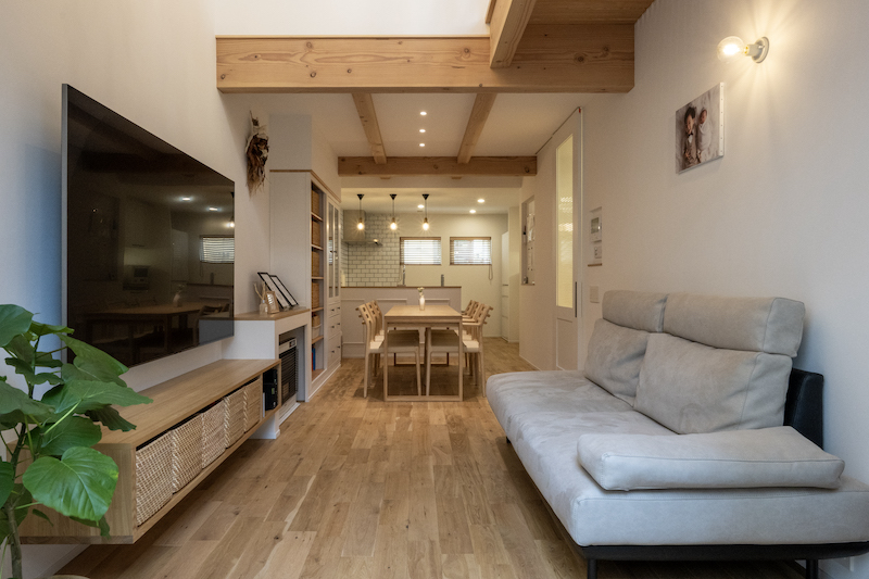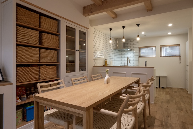 2階にあるLDK。間口2間を最大限に活用した空間に。テイストはカントリーフレンチのようなテイストをご希望。サブウェイタイル、フィラメント(LED)裸電球、モールディング、奥様と綿密に素材やインテリアバランスを確認しながらこだわりの空間です。また造作家具のように見えるのはIKEAのカップボード二連をビルトイン。コスパを考えた収納提案です。狭小空間に設置するダイニングテーブルも1センチ刻みでご夫婦と一緒に確認したオリジナルテーブル。チェアもファイブセンスセレクトです。