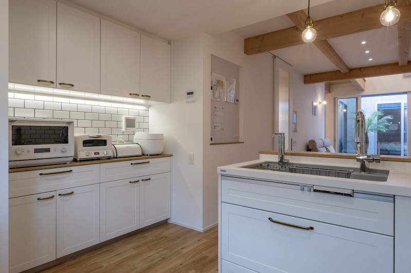 キッチンは「対面にしたい・BOSCHの食洗機を入れたい・3連コンロが欲しい」というご要望。物理的に完全対面にすることが不可能だったため、L型タイプで製作範囲ぎりぎりのキッチンプランを実現。結果オーライでとても使いやすいと奥様にも喜んでいただきました。