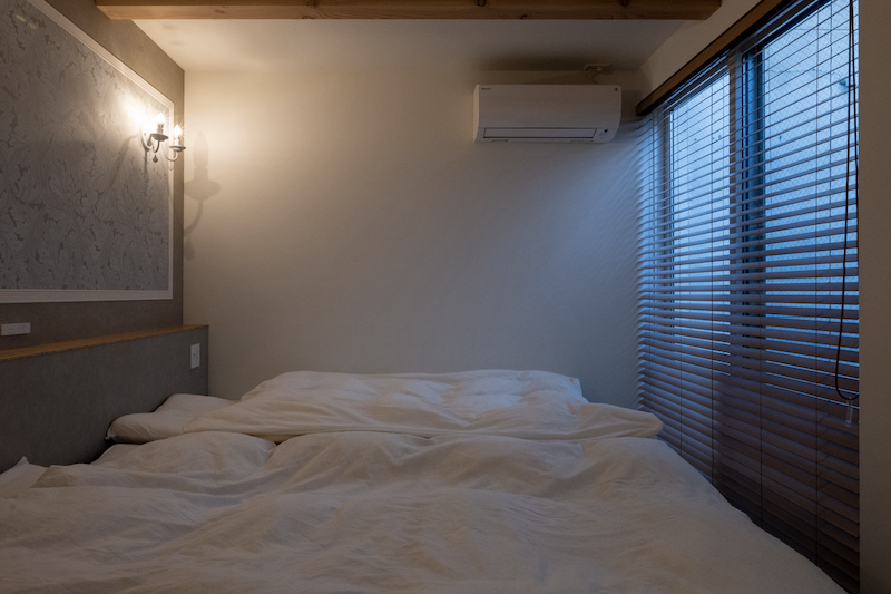 中庭に面したベッドルーム。ベッドフレーム、マットレスをお聞きしヘッドボードを造作。ご主人様が夜間に帰宅された際にリビングからの照明が眩しくないように、ウッドブラインドをチョイス。