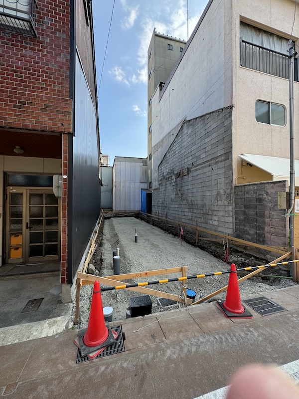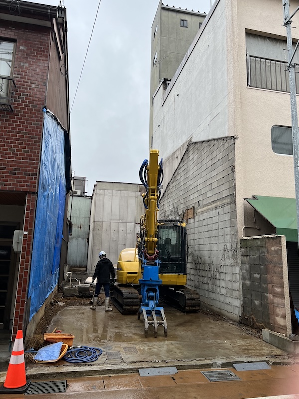 まずは新居建設のために既存建物を解体します。狭い場所での重機の取り回しや運搬など、ご近隣への配慮をしながらの解体。